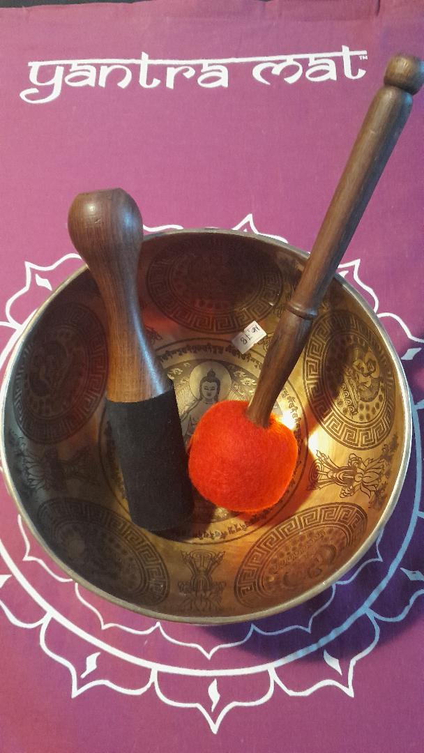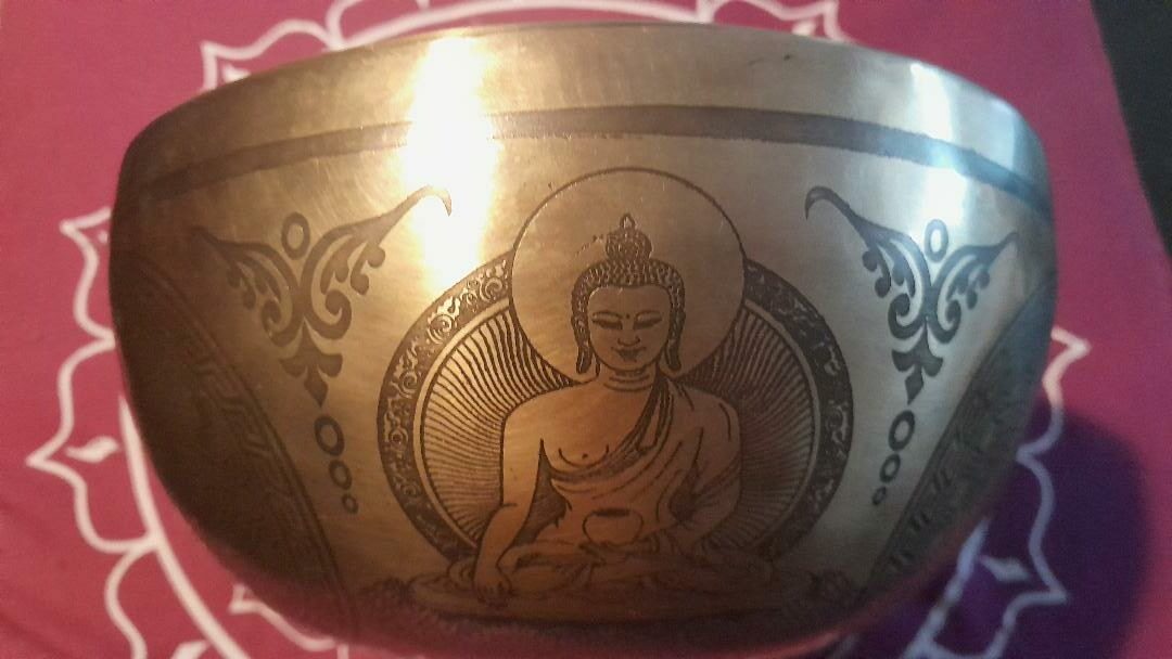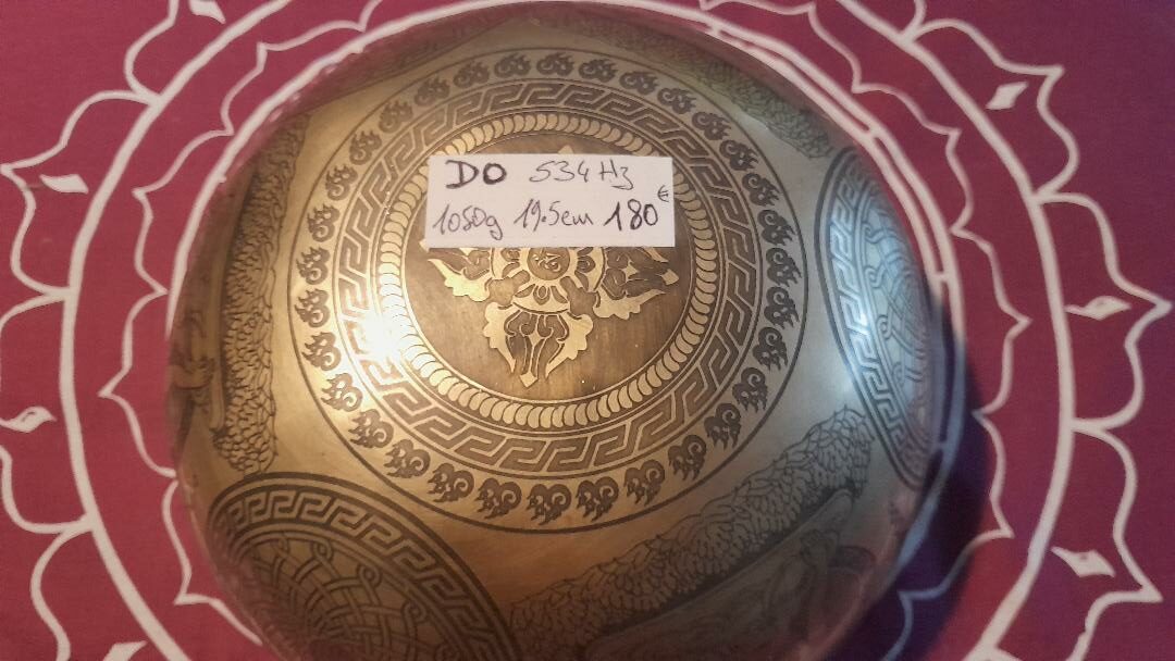 Magnifique bol tibétain décoré avec un Bouddha central ainsi que des Bouddha gravés à l’intérieur et à l’extérieur des parois du bol. Note Do, 534 hz, diamètre 19,50 cm, poids 1050 g, prix 180,00 bol et coussin. En supplément 1 maillet, 1 mailloche + 20€ ).